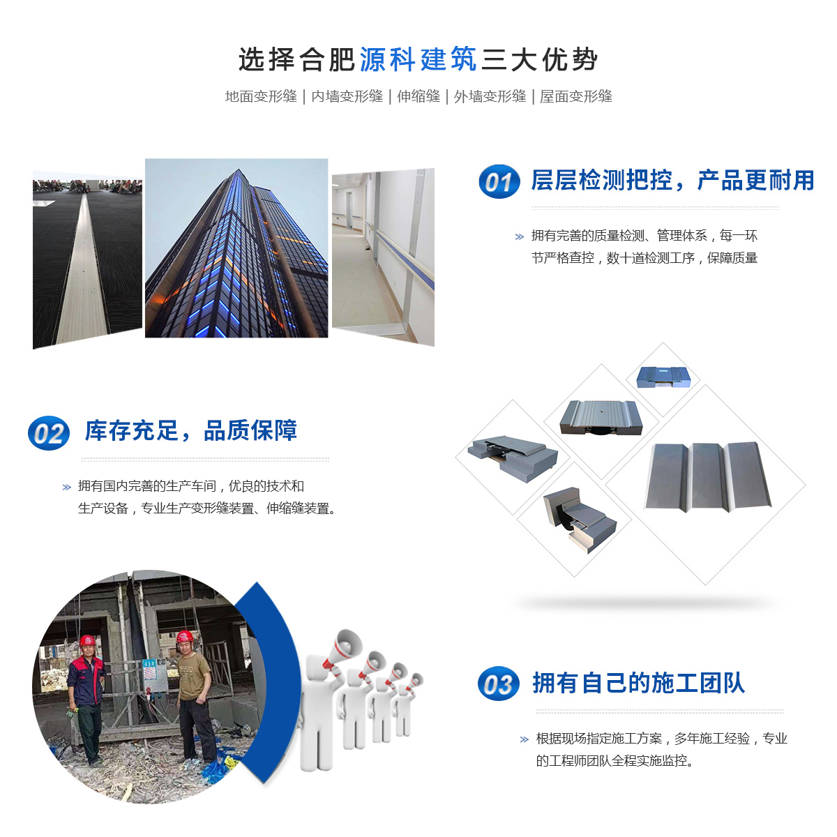 合肥源科建筑科技有限公司位于長三角城市群副中心的合肥,面向國內外生產銷售是專業研發及產銷各種建筑伸縮縫、地面變形縫、內外墻變形縫等裝置。參與了省內大型工程(醫院、學校、工廠、大型商場超市等)建設,是諸多建設單位和設計學院長期合作單位,在建筑變形縫伸縮縫行業樹立了自己的專業形象。本公司根據建筑業的發展和用戶的實際需要,深入研制出目前國內新型的建筑伸縮縫裝置。按照使用部位分為四個類別:樓地面變形縫;內墻、頂棚吊頂變形縫;外墻變形縫;屋面變形縫;按照變形...